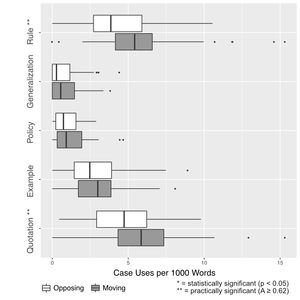 The four rational uses of cases that the pilot study identified correspond to the topoi described above. First, authors who cite a case for a legal rule are using an empirical topos, often quoting an opinion when asserting what a rule of law is. Citation to a prior opinion supports the claim that the rule exists in the form the authors assert. Second, the use of a case example, where the author describes a previous case, including facts about it and its outcome, then argues that the instant case should come out the same (opposite) way because the cases were (dis)similar, is a conventional topos.[117] Though that approach is common in legal reasoning, it does not compel a conclusion to the same extent that the first does. Third, the author uses a values-based topos when citing a prior opinion to assert that a policy goal or consideration supports a particular outcome. Though this is still a rational appeal, courts are reluctant to apply policies directly to facts, as that places them in the role of legislatures; the possible exception is policies arising in and from the rules of court themselves, where judges have broader discretion. A fourth category of case use, asserting that courts in previous cases have generally taken a particular approach, did not fit easily into the three legal topoi, but it was common enough to warrant its own category here. Such a rule of probability or rule of thumb requires an inferential step from ‘several have been decided in a certain way’ to ‘this case should be decided the same way.’ It is thus something like an empirical argument, but the number of cases cited to make a generalization was sometimes as small as one, and that does not satisfy any commonly accepted form of inductive reasoning; consequently, such generalizations seem to be conventional (or field-dependent) in the law.