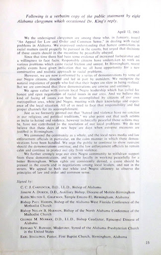Shortly after his arrest, King received a newspaper that contained “A Call for Unity”—an open letter published in the Birmingham News by eight clergymen from Alabama—Bishop C. C. J. Carpenter, Bishop Joseph A. Durick, Rabbi Milton L. Grafman, Bishop Paul Hardin, Bishop Nolan B. Harmon, Reverend George M. Murray, Reverend Edward V. Ramage, and Reverend Earl Stallings.[14]